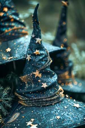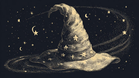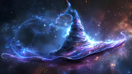 Magical hat constellation glimmering in the nebula. Starry witch's headwear in the universe. Concept of celestial enchantment, cosmic sorcery, astral magic, and fantasy cosmos.