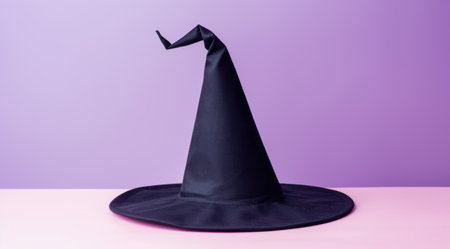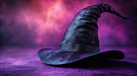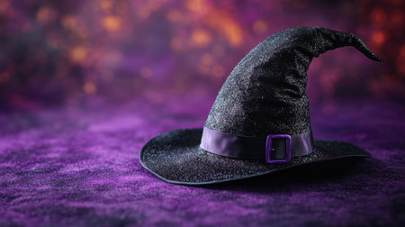 A black witch hat with a purple band lies on a textured purple background, perfect for Halloween-themed decorations
