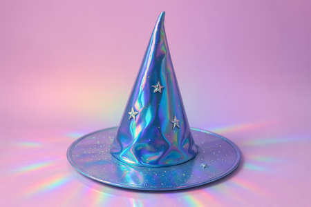 Holographic witch hat with star decoration on pink background. concept of magical costume, halloween accessory, fantasy fashion.