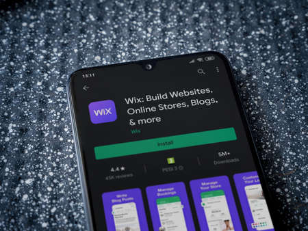 Lod, Israel - July 8, 2020: Wix app play store page on the display of a black mobile smartphone on a metallic background. Close up top view flat lay.