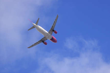 The plane flies in the sky in clear weather. Airplane in the sky. Airplane before landing. The plane is flying. Russia, St. Petersburg, April 27, 2018
