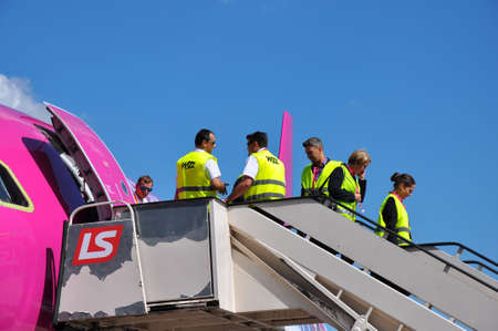 KATOWICE - JULY 2: Cabin crew staff leaving the Wizzair Airbus A320 after the landing on July 2, 2015 in Katowice Airport, Poland. Wizzair is one of the largest low-cost airlines.