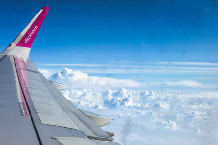 Vilnius Reykjavik - August 2019. Wizz Air plane wing in the sky above the clouds with space for text, advertising
