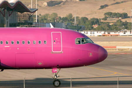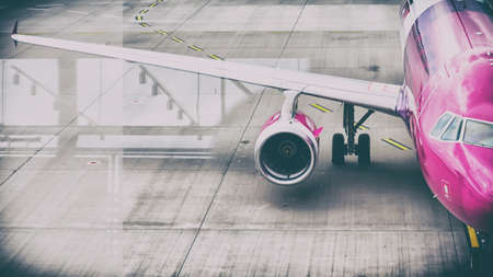 The pink engine of a passenger plane