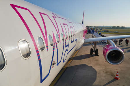 BUDAPEST, HUNGARY - MAY 5: Passengers boarding a Wizzair airliner at Budapest Liszt Ferenc Airport, May 5th 2012. Wizzair is a rapidly growing low-cost carrier based in Hungary.