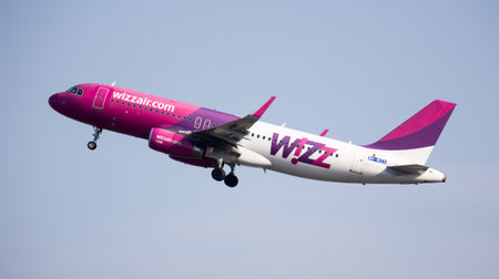 Kharkiv, Ukraine - August 08, 2021: Departure of Wizzair airline flight from Kharkiv airport. Wizzair is a Hungarian low cost airline.