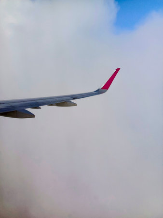 Wing of an airplane in the clouds. View from the window.