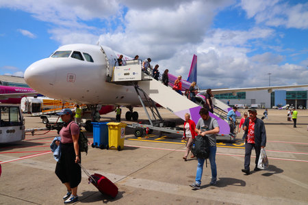 LUTON, UK - JULY 12, 2019: Passengers disembark Wizz Air Airbus A320 low coast plane at London Luton Airport in the UK. It is UK's 5th busiest airport with 16.5 million annual passengers.