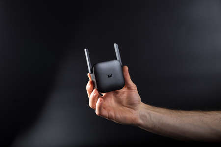 Man's Hand holding WiFi Amplifier from Xiaomi on black background, with copy space.