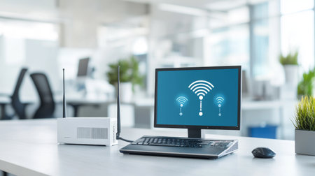 A sleek computer setup featuring a monitor and Wi-Fi router, showcasing connectivity and technology in a modern office environment with greenery.