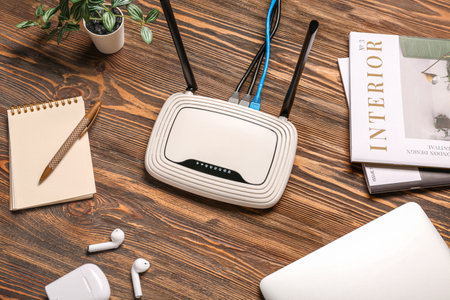 Modern wi-fi router with earphones and magazines on wooden background