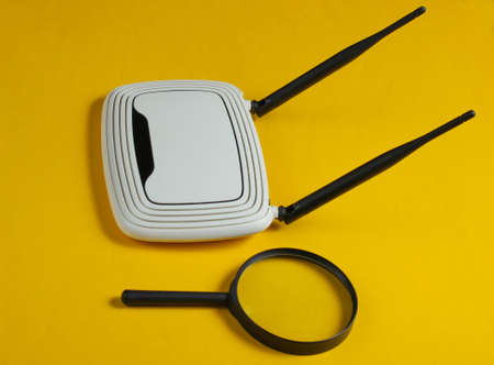 Search on the Internet. Wifi router and magnifier on yellow paper background.
