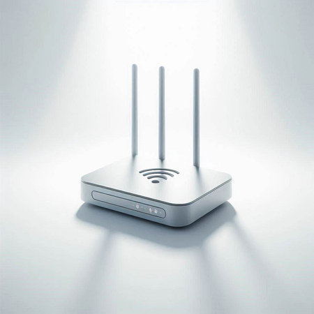 A wireless router with digital waves radiating outward, representing strong wireless communication signals, set against a clean, minimalist tech-inspired backdrop.