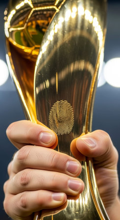 Closeup of a hand holding a shiny gold trophy cup with a blurred background