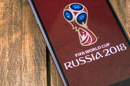 Apple iPhone with FIFA World Cup Russia 2018 logo. Ekaterinburg, Russia - May 11, 2018