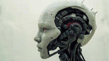 Futuristic robotic head showcasing advanced technology with exposed circuits and components in a clean, minimalistic background, emphasizing innovation and design