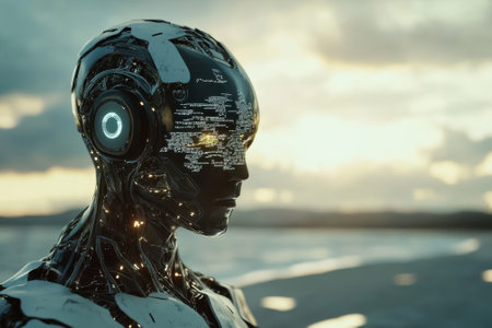 A humanoid robot with a sleek design gazes toward the horizon at sunset by the water, reflecting advanced technology.