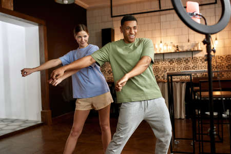 Group go young Tik-tokers recording a video content on street, dancing and having fun.
