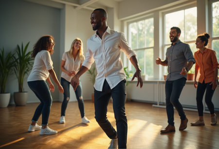 A group of friends dances joyfully in a living room, enjoying each others company in a fun and lively atmosphere. The bright, sunlit space adds warmth to their carefree celebration.