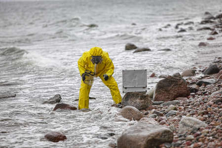 researcher in protective lab gear is gathering water samples from sewage treatment tank