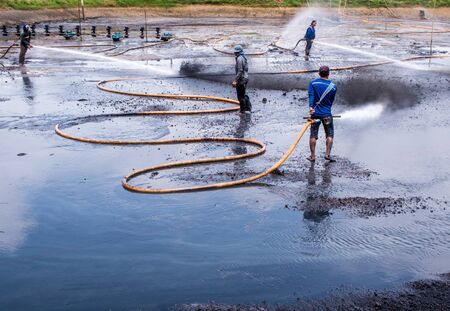 CHACHOENGSAO THAILAND - JULY 13 : Unidentified men control high pressure water jet nozzle to clean the mud at the bottom of the pond on July 13, 2016 to prepare the pond clean, for next time shrimp farming, Chachoengsao, Thailand.