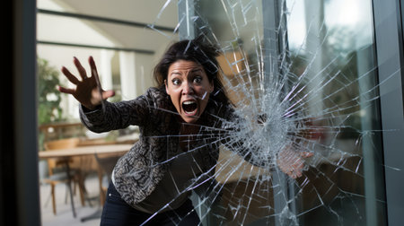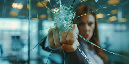 A woman in business attire breaks glass ceiling in office with punch. Concept Empowerment, Glass Ceiling, Business Woman, Office Struggle, Breaking Barriers