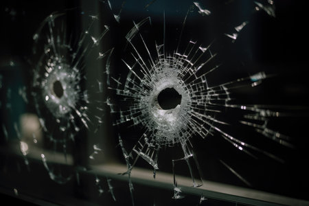 bullet hole in the glass with a blurred city in the background creates a sense of danger and tension. Generative AI