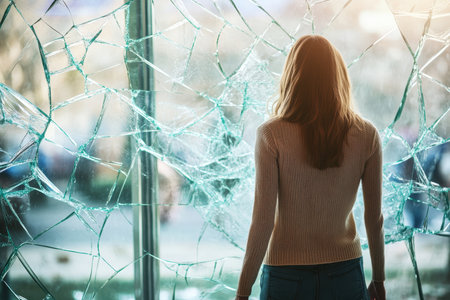 A striking image of shattered glass captures the moment of impact against an urban backdrop, showcasing light reflections and the chaos of city life.