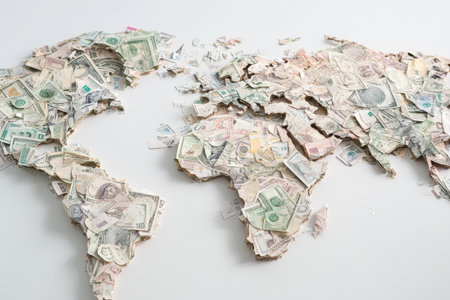 A detailed world map is creatively constructed from assorted paper currency, displaying intricate layers and diverse notes from various nations, highlighting an innovative blend of art and economy.