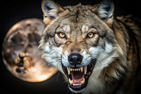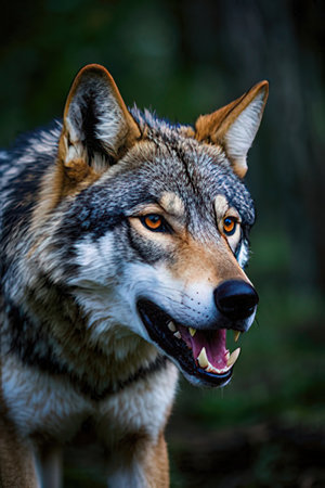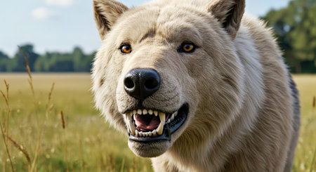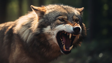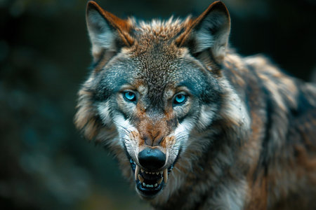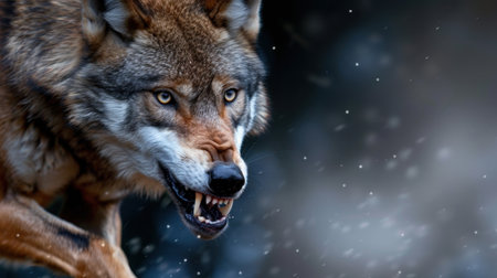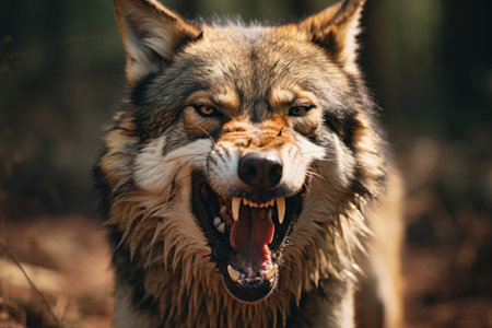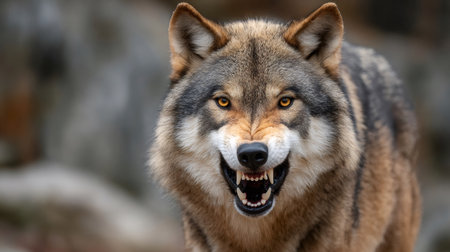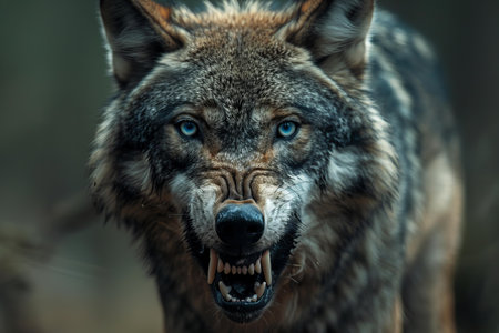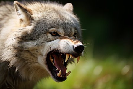 A striking close-up of a wild wolf showcasing its fierce expression and sharp teeth. This captivating image captures the essence of nature's predator in its natural habitat.