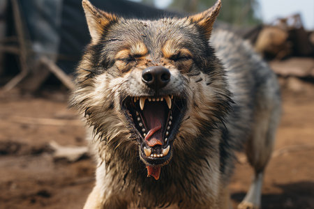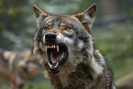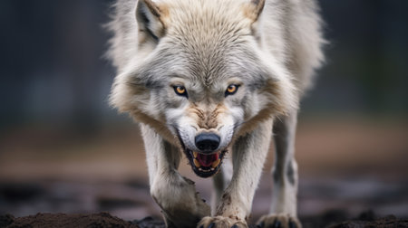 A wolf with its mouth open wide, baring its sharp teeth in a threatening display of aggression. The animal appears ready to attack, showcasing its primal instinct and power.