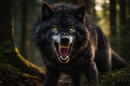 Aggressive Black Wolf Showing Teeth in Dark Forest
