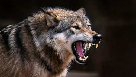 This striking close-up captures an aggressive gray wolf displaying its teeth, conveying raw power and intensity through its fierce expression and dramatic lighting.