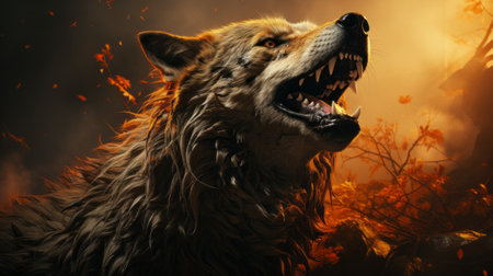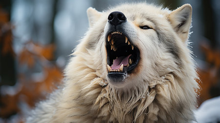 Close up of a fierce looking dog or wolf like canine yawning aggressively in an autumnal forest with trees and foliage in the background