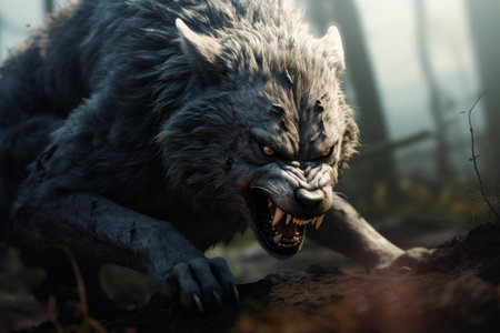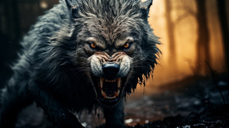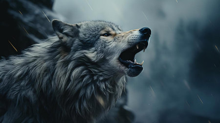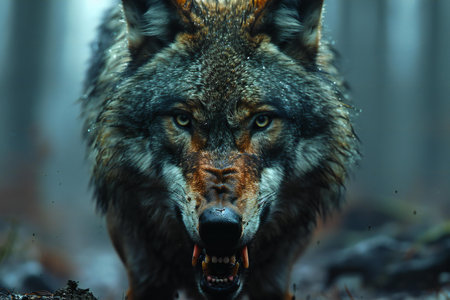 Fierce gray wolf growls menacingly in a dark, foggy woodland setting