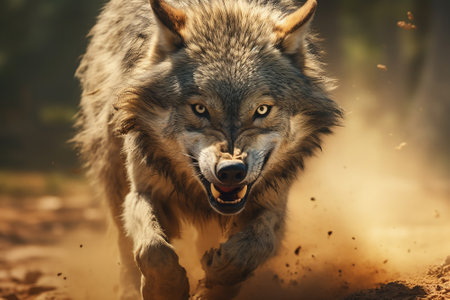 A fierce wolf on a forest path, with an angry expression and teeth bared, symbolizing the raw power of nature