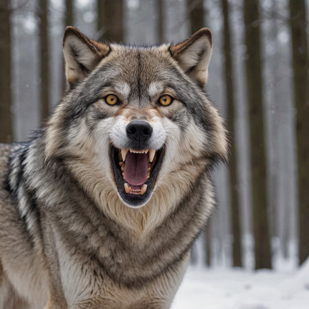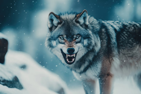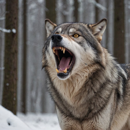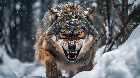 An AI generated illustration of a snarling dangerous gray wolf in a snowy forest