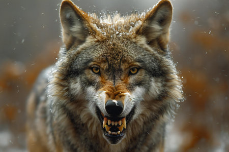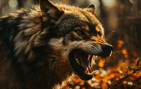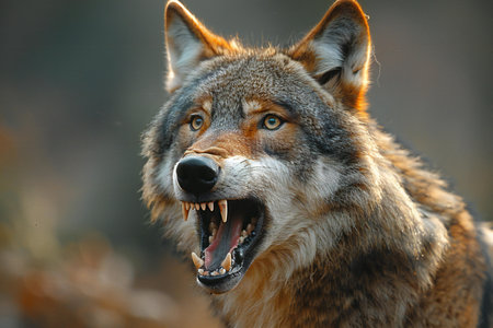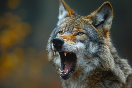 Closeup of a fierce grey wolf displaying aggression, set against a soft, autumnal background