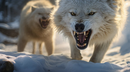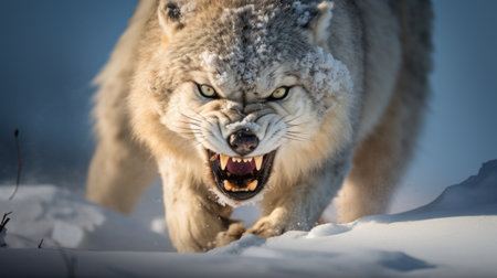 A dramatic and intense close-up photograph of a fierce wolf in a snowy environment, capturing its sharp teeth and piercing eyes, emphasizing the beauty of wild nature.