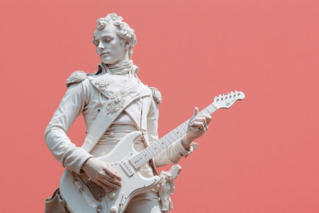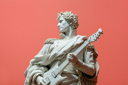Contemporary statue of a musician with a guitar against a vibrant pink backdrop