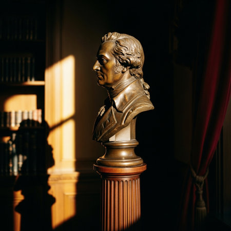 A classical marble bust of a Roman emperor or nobleman is dramatically illuminated by a single shaft of light from above, casting deep shadows. The dust particles in the light beam add to the atmospheric and historical mood of the ancient artwork.