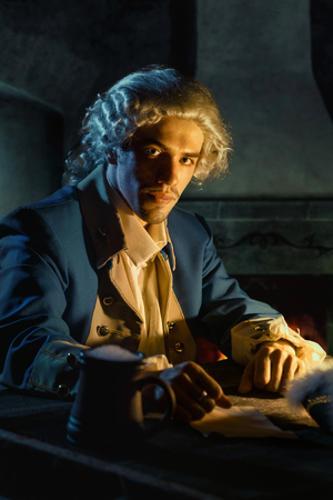 actor dressed as an aristocrat from the eighteenth century wearing a wig