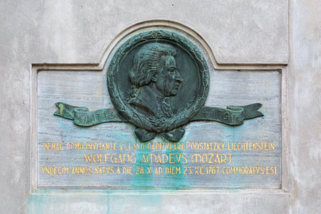 OLOMOUC, CZECH REPUBLIC - JULY 30, 2019: Commemorative plaque with portrait of Wolfgang Amadeus Mozart on the wall of Chapter Dean's residence. The bronze relief portrait was created by Julius Pelikan