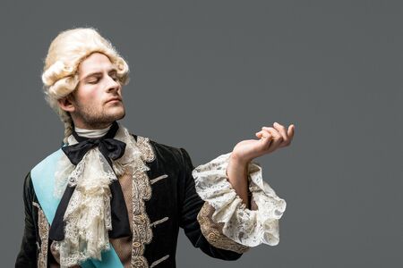 pompous victorian gentleman in wig standing and gesturing isolated on white