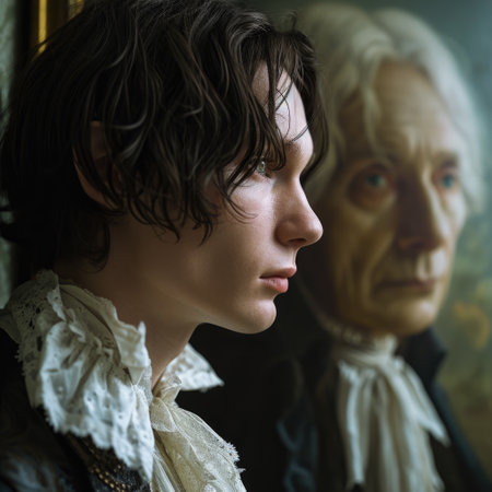 The enigmatic young man, poised beside his aging portrait, sparks a mystical tale of eternal charm and hidden enigma, painting concealing his aging years, wrapped in an enigmatic shroud of mystery