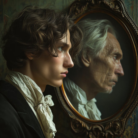 Young man standing next to his aging portrait: the mystique of the composition, where the painting conceals his old years, enabling him to endure in eternal youthfulness