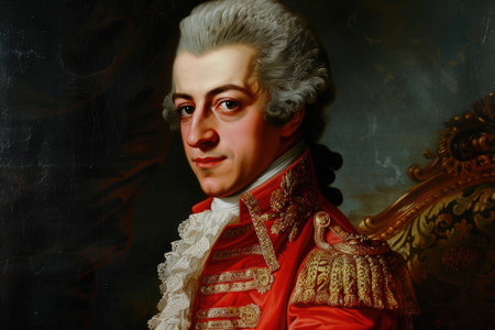 The young composer Wolfgang Amadeus Mozart is depicted seated wearing ornate 18th century clothing. His expression reflects both confidence and youthful talent capturing a pivotal moment in history.