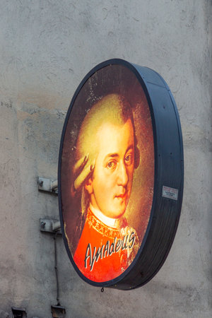 Vienna, Austria - April 25, 2015: advertising neon light with Amadeus Mozart in Vienna to honor the most famous musician of Vienna.