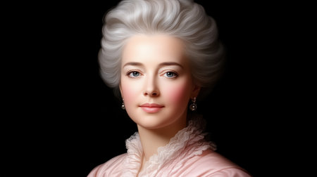 Elegant woman in 18th-century fashion with classic hairstyle and pearl earrings. Vintage aristocratic beauty