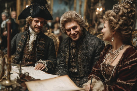 Three renowned composers interact joyfully at an elegant event sharing thoughts and ideas on their musical creations. Their rich attire reflects the grandeur of the era they represent.